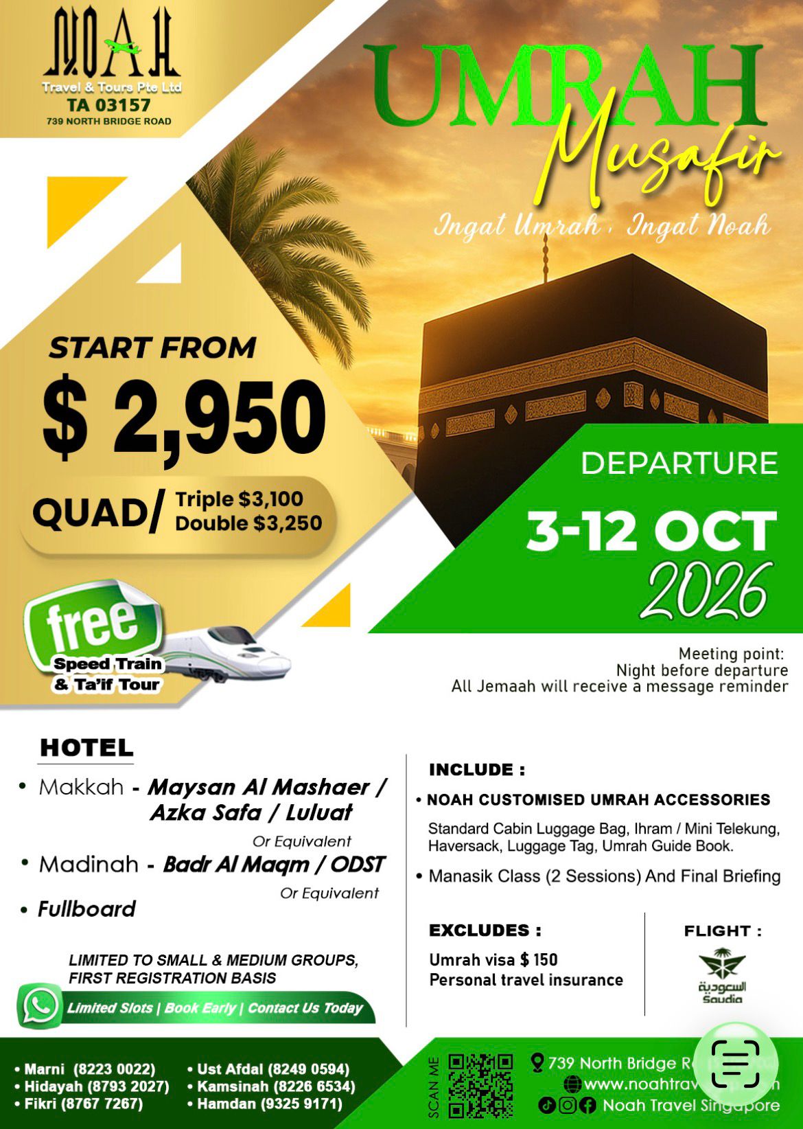 A spiritually focused 10-day Umrah journey departing 3–12 October 2026 with full-board accommodation, speed train experience, and guided manasik sessions. Ideal for small and medium groups.